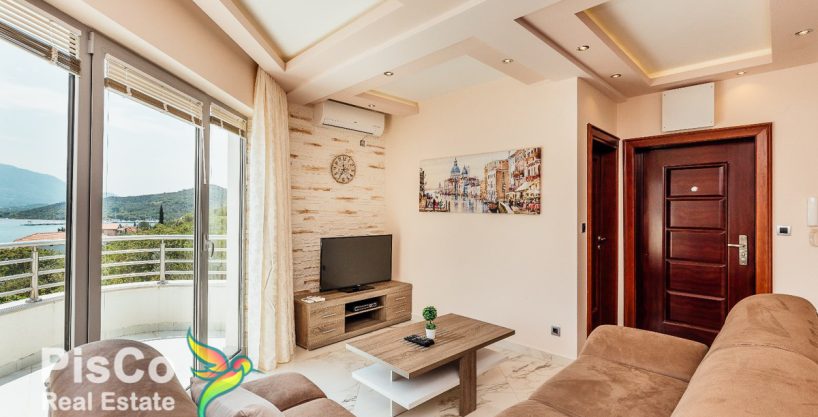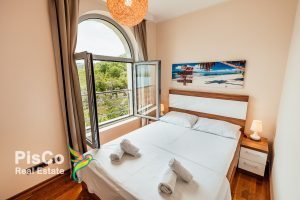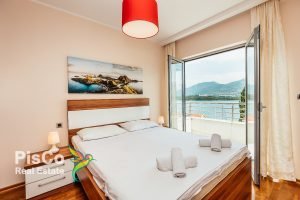 The apartment is two-room, 64m2, furnished and equipped to the smallest detail. The living room is spacious and comfortable, well lit because there are a lot of glass surfaces in the form of windows and balcony doors. It has a large corner sofa, TV and air conditioning, and countless fine decorative details and lighting. From the living room there is a balcony that faces the sea and offers a wonderful view of the sea and the mountains. It includes a dining area with a table and chairs, which is located next to a large window that also offers a view of the sea. The kitchen has bright tones, made of quality materials, modern design. It has all the necessary devices.
