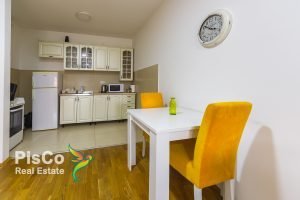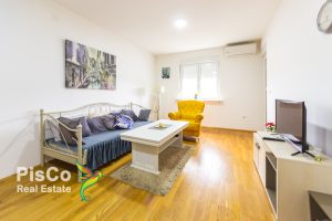 Stan je veoma lijepo uređen, čist, očuvan i lijepo osvijetljen. Dnevni boravak je opremljen trosjedom, foteljom, ima TV i klima uređaj. U sklopu dnevnog boravka je trpezarija sa manjim stolom i dvije stolice a u nastavku kuhinja koja je opremljena svim neophodnim elementima i uređajima. Spavaća soba je prostrana, sa velikim bračnim krevetom i ormanom, i ima izlaz na terasu. Kupatilo je sa tuš kabinom i veš mašinom.