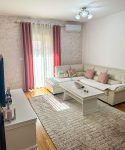 Stan je veoma lijepo strukturiran i nov. Opremljen je modernim namještajem u svakoj prostoriji. U dnevnoj sobi, iz koje ima izlaz na balkon, nalaze se garnitura i TV sa komodom. U produžetku je strpezarijski sto i kuhinja opremljena svim potrebnim kuhinjskim aparatima (šporet, frižider, aspirator, mašina za suđe). U dvevnoj sobi je bračni krevet i veliki garderober a u kupatilu su postavljeni tuš kabina i veš mašina.