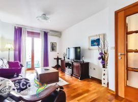 Trosoban stan, površine 90m2, potpuno opremljen i komforan. Dnevni boravak ima velike prozore i balkonska vrata tako da je sa dosta prirodne svijetlosti, što cio prostor čini dodatno prostranim. U dnevnom boravku su udobna garnitura, TV i klima uređaj, i pregršt lijepih dekorativnih detalja. Kuhinja je odvojena komforna i funkcionalna, lijepih svijetlih tonova, kvalitetnog i modernog dizajna, opremljena svim neophodnim uređajima.