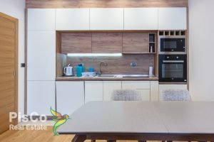 Kvalitetan i moderan italijanski namještaj “Natuzzi”, dok je kuhinja “Enza Home” ali i pažljivo birani detalji, čine ovaj stan privlačnim i prijatnim prostorom za život. Stan sa dosta prirodne svijetlosti, prostran i komforan. Dnevni boravak je svijetlih tonova, sa velikom garniturom, stolom, TV i klima uređajem. Velike staklene površine čine ovaj prostor lijepo osvijetljenim. U nastavku je trpezarijski dio sa stolom i stolicama, kao i kuhinja. Potpuno nova, funkcionalna, sa svim neophodnim uređajima, opremljena do najsitnijih detalja. Jena spavaća soba je opremljena velikim bračnim krevetom, ormanom i televizorom dok je u drugoj singl krevet. Kupatilo ima kvalitetnu i lijepu keramiku, veliku tuš kabinu i veš mašinu.