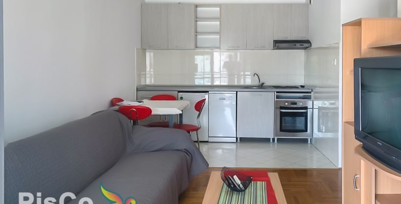 The apartment is smaller but very nicely decorated, cozy and comfortable. The living room is lit by large balcony doors and windows, has furniture and air conditioning. Below is the dining area with table and chairs, and the kitchen, which is equipped with all necessary appliances and very functional. The bedroom has two single beds and a wardrobe.