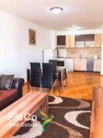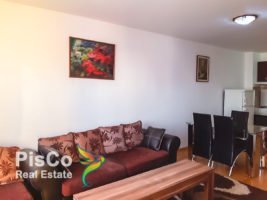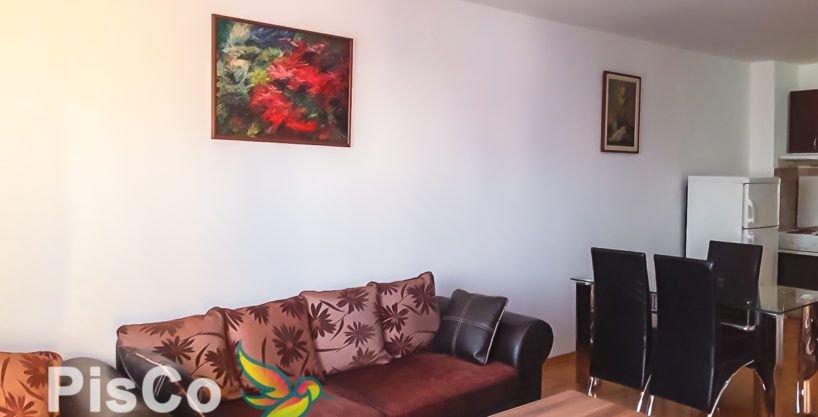 The apartment is nicely decorated, comfortable and well lit. The living room has furniture, TV and air conditioning, beautiful decorative details. Below is the dining area and from there you enter the kitchen. It is a beautiful combination of colors, clean and functional, with all the necessary devices. The bedroom has a large double bed and a wardrobe. The bathroom is nicely decorated, has a bathtub and a washing machine. The apartment has a balcony and is located in a building with an elevator.