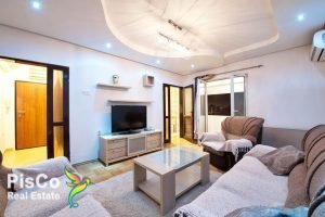 This two-room apartment of 75m2 is very nicely furnished and decorated. The living room is very spacious, has a corner sofa, suspended ceilings and lighting, as well as a chest of drawers with a smart TV. The kitchen and dining room are separated from the living room. The solid wood kitchen is equipped with all the necessary elements and appliances. In one bedroom there is a double bed and in the other a functional single bed with two drawers in which you can put a mattress and there is air conditioning. Both rooms have large wardrobes. The bathroom has a bathtub and a large washing machine. In the hallway, there is a huge closet that can be used as a storage room, a shoe rack also up to the ceiling, and an anteroom with a hanger and several drawers. The apartment is air-conditioned (inverter air conditioning) and opens onto two glazed terraces. The building has an elevator and an intercom, and there are plenty of parking spaces in front.