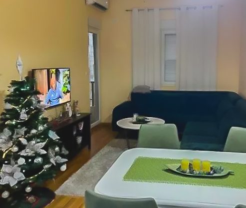 The apartment is nicely furnished, it has a living room equipped with a sofa and a plasma TV. There is also a dining table with chairs, as well as a kitchen that has all the kitchen elements and white goods. There are also two bedrooms, one with a double bed and a wardrobe for storing things, while the other is equipped as a children’s room. The apartment also has a nice balcony, and there is a bathroom that is completely renovated.