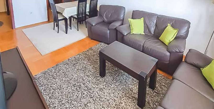 The apartment is one-bedroom and nicely furnished and tidy, and is located in a building that has an elevator. The living room is decorated in style and is decorated with a comfortable set that fits perfectly into the interior of the apartment. The living room also has a dining table and a kitchen that is separate from the living room. The kitchen is equipped with modern technology, and the elements that adorn it are brand new and beautifully fitted into the whole. There is also a bedroom where a very pleasant stay and a good night’s sleep is guaranteed. The bedroom space fills the large double bed and closet. The apartment is air-conditioned.