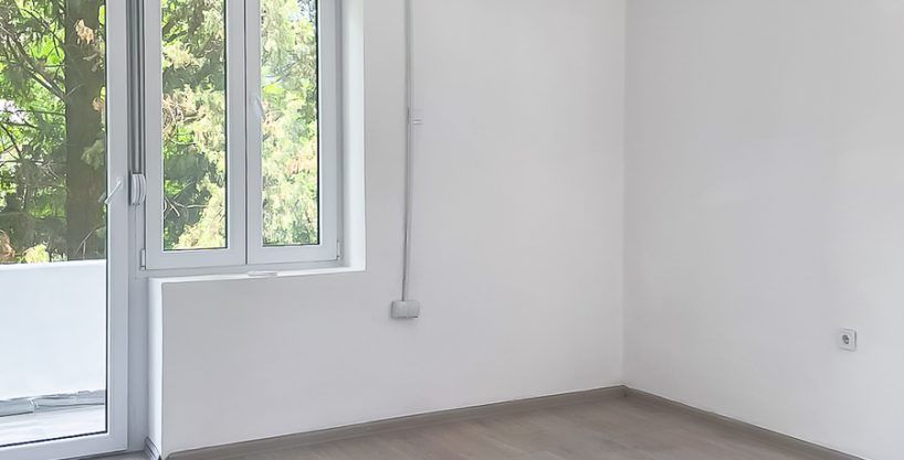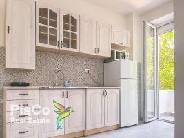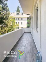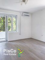 The apartment is renovated, with light-colored walls and floors, very nicely lit and functional. The structure is three-room, 80m2. It has a new kitchen with basic elements and appliances, a dining table with chairs, and air conditioning. All three rooms are unfurnished, so this apartment is more suitable as an office space. It has a large balcony facing the courtyard side with trees and greenery.