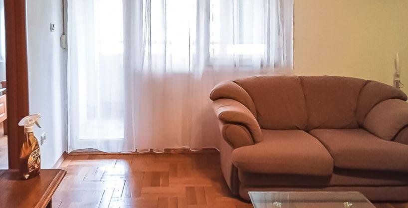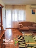 The apartment has a large living room, beautifully lit with large windows and balcony doors. It has TV and air conditioning. There is a dining room, while the kitchen is separate. The kitchen is equipped with all necessary elements and appliances. The bedroom has a large double bed and a wardrobe. The bathroom is nicely decorated, and has a bathtub and washing machine.