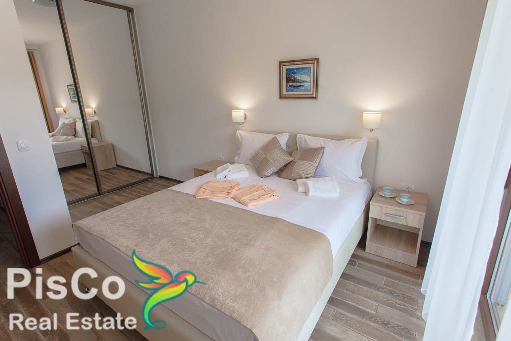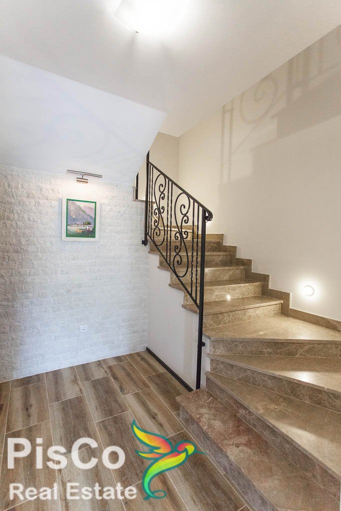 The apartment has a separate entrance, entrance terrace 30m2. The area is 145m2 with a lower terrace, in the yard there is a swimming pool with sea salt and a platform with deck chairs. Ground floor – hallway, large bathroom, living room – kitchen, dining room, living room with exit to the terrace. Second floor – hallway, bathroom, two bedrooms with locker rooms, each bedroom has a terrace overlooking the sea. Sold fully furnished and equipped. Marble staircase to the second floor, forging, natural stone, protective shutters on the windows, air conditioning in each room. Parking is included in the price.