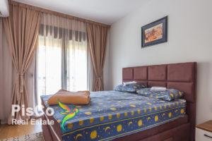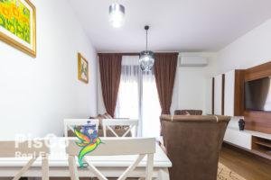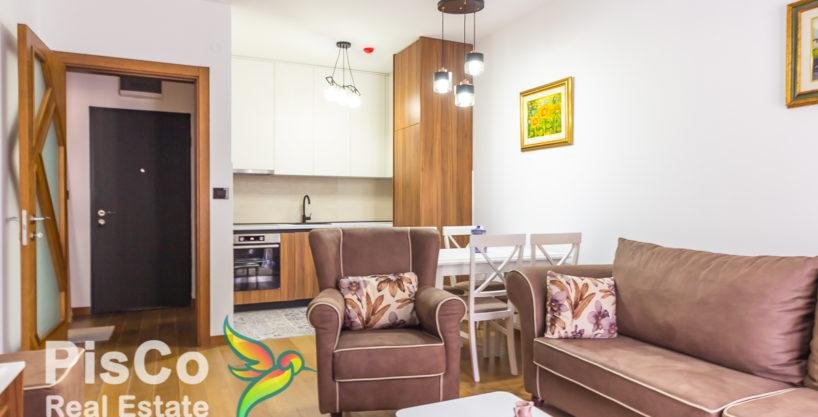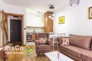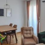 The apartment is one bedroom, 50m2 in size, nicely laid out, facing the courtyard side of the complex. The living room is beautifully lit, with large balcony doors. It has a three-seater and two armchairs, TV and air conditioning, very nice lighting and decorative details. Inside is a dining table with chairs, followed by a kitchen. The kitchen has all built-in appliances, nice combination of materials. The bedroom is spacious, with a large double bed and built-in wardrobe, and it is also air-conditioned. The bathroom has a large shower cabin, and washing and drying machines. There is a built-in closet in the hallway.