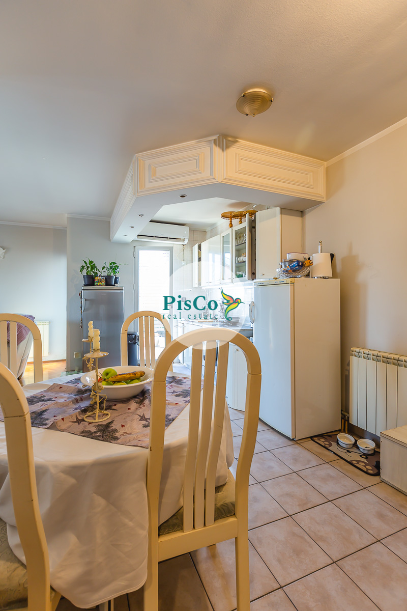 The apartment has a functional layout with two bedrooms and a registered area of 70m², a large bathroom, a storage room, and a spacious living room connected to the kitchen and dining area. There are also two lovely terraces offering views of the city and Ljubović Hill. The rooms are well arranged, making the space very functional. The flooring is a combination of parquet and ceramic tiles.