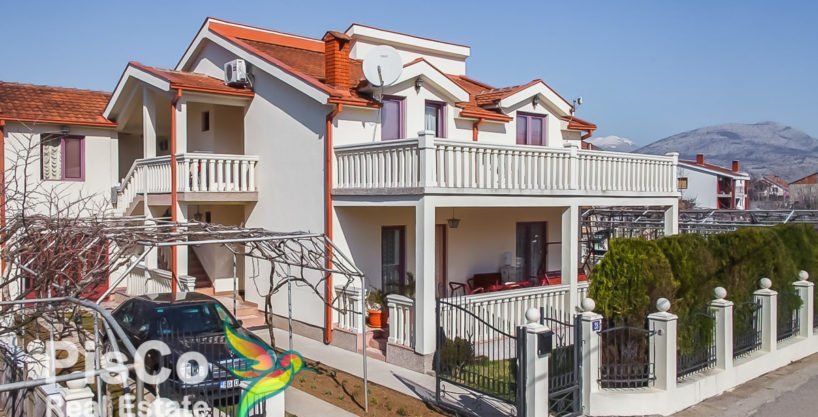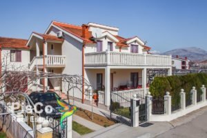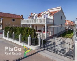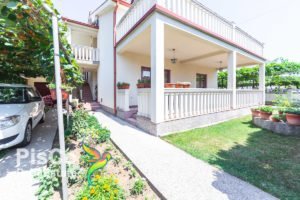 The house has an area of 375m2, on a plot of 600m2. In front of the house is a part of the lawn, as well as a space for parking cars. Next to and behind the house is the remaining part of the yard and lawn, with several fruit trees. In the back part of the house is a small summer house suitable for spending time with family and friends. In one part of the ground floor there is a summer kitchen, fully equipped, very functional and practical. The ground floor and first floor of the house have an identical arrangement of rooms on two levels. The hall is large, with a closet. From it you enter the large living room, which has access to the balcony along its entire length, so it is very nicely lit. It has a three-seater, a two-seater and an armchair, TV and air conditioning, and nice decorative details. Inside is a dining table with chairs, followed by a kitchen. It is equipped with all necessary elements, spacious and functional. There is also a guest toilet on this level. The second level is only a few steps up, it has a hallway, a large bathroom, and three bedrooms. The rooms are spacious, bright and have access to a large balcony at the back of the house. And these rooms are fully equipped.