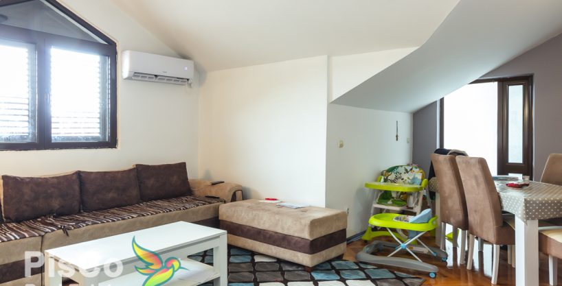 The apartment is sold furnished. The living room has a large set, a TV, and beautiful decorative details. The dining room is spacious, located by the balcony door. From it you enter the kitchen, which is separated from the living room by a wall, and which is fully equipped with all the necessary appliances. The bedrooms are spacious and equipped with double beds and wardrobes. One of the nicest parts of the apartment is the large glazed balcony that can be converted into another bedroom, very nicely lit with a view of Morača.