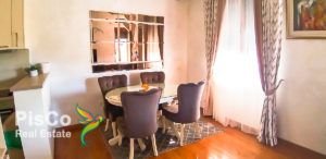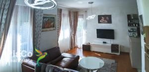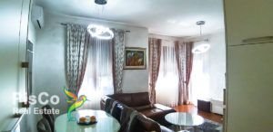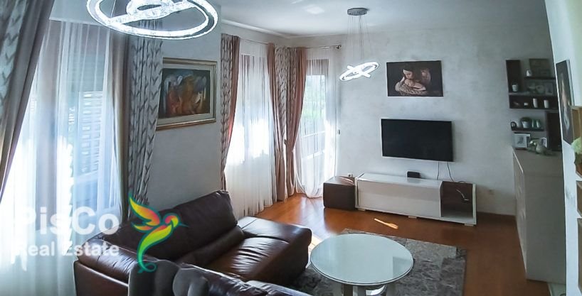 Stan je prostran i komforan, lijepo opremljen. Dnevna soba je velika, posjeduje garnituru, TV i klima uređaj, i ima mnogo dekorativnih detalja i modernu rasvjetu. Ima dva velika prozora i balkonska vrata zbog čega je veoma dobro osvijetljena. U okviru dnevnog boravka je trpezarijski sto sa stolicama, dok je kuhinja pregrađena manjim niskim zidom u vidu šanka. Spavaće sobe su takođe prostrane, opremljene svim neophodnim komadima namještaja, i sa dosta skladišnih elemenata. Kupatilo je lijepo uređeno, sa veš mašinom.