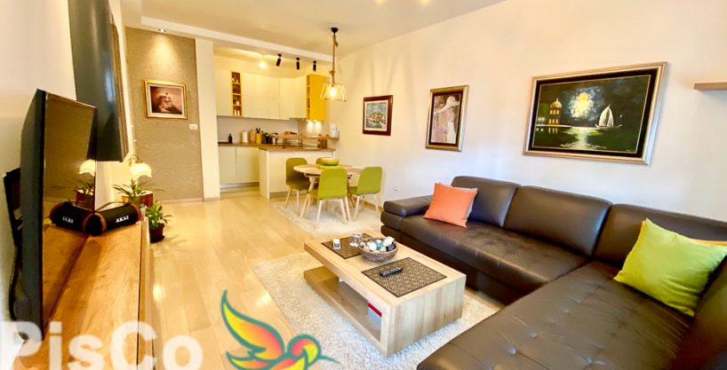 The apartment is located on the fifth floor of a newly built building with an elevator. The apartment is equipped with brand new things and looks very luxurious . The apartment itself leaves a very strong impression and we are sure you will like it. The structure of the apartment is such that the living room is very spacious and it is connected to the kitchen and dining room. The living room is equipped with comfortable furniture and a new plasma TV, and the kitchen has a beautiful built-in kitchen that fits perfectly into the interior of the apartment. There is one bedroom whose space is filled by a double bed . The apartment is air-conditioned.