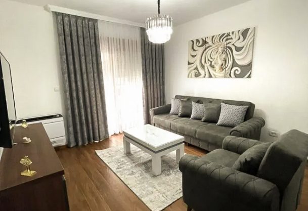 The apartment is furnished, spacious, comfortable, with nicely arranged rooms, this apartment is the right choice if you like modern design. The living room is equipped with beautiful, new furniture, fine decorative details, and has access to the balcony which allows a lot of natural light in this room. Below is the dining area with a modern table and chairs, from which the kitchen continues. It is equipped with new, modern kitchen elements of beautiful design and high technology, which will make preparing meals for family and friends easy and simple. Floors, carpentry, hardware, tiles, and all appliances in the apartment are new and of high quality. Everything is designed and blended with taste.