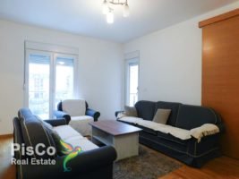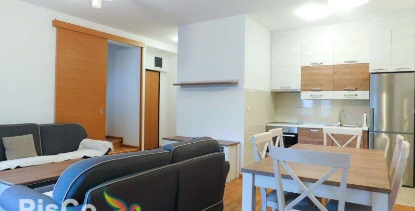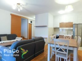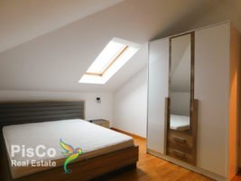 The apartment is very modern and is sold furnished. The living room has a new set, a dining table and a new modern kitchen with all kitchen appliances. A wooden sliding door separates the staircase from the living room, which leads to the second level, where there are three rooms and a bathroom. In two rooms there are double beds and closets and in the third there are two single beds. The apartment is fully air conditioned, has an intercom and the bathroom has a bathtub and washing machine.