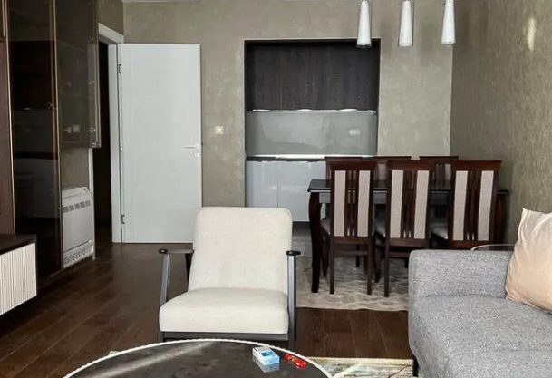 The apartment has two rooms and is 70m2, it is very comfortable and pleasant to stay in. It is equipped with new items of top quality, as well as other equipment and technology. The living room is extremely nicely furnished and pleasant for everyday living, it is connected to the kitchen with all the necessary equipment and elements, and there is also a dining table. The space of one bedroom is filled with a double bed and a large closet, while the other room will be empty. The apartment has a bathroom and a toilet.