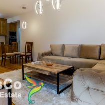 We invite you to take a look at this apartment, one of those places that captivates at first sight with its simplicity and light, pleasant atmosphere. The apartment is extremely luxuriously arranged and provides the feeling of being in the world’s largest metropolis. The living room is extremely large and is decorated with furniture of the highest quality, it is connected to the kitchen and dining room with the most modern technology and equipment (note – the dining table and TV set that were added later are not visible in the pictures). The bedroom is of standard size and the space in it is filled with a large double bed of exceptional comfort and convenience.