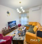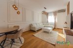 The apartment is one-bedroom, 48m2, with a nice layout. The living room is nicely lit, with large balcony doors. It has a large set, TV and air conditioning, very nice lighting and decorative details. There is a dining table with chairs and a kitchen below. The kitchen has all built-in appliances, a nice combination of materials. The bedroom is spacious, with a large double bed and wardrobe, and it is also air-conditioned. The bathroom has a large shower cabin and a washing machine.