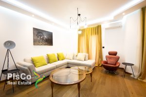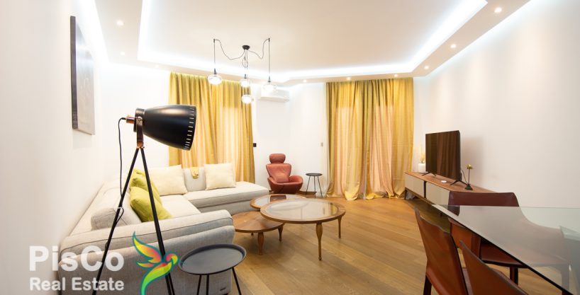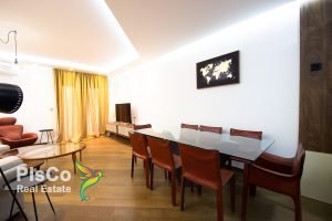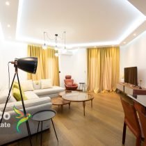 The apartment is two-room, 76m2, designerly furnished with new, modern and high-quality pieces of furniture. When decorating the space, attention was paid to the smallest details such as decorative objects, colors, lighting, materials. The living room is spacious and beautifully lit by large balcony doors. The set is in light tones, perfectly integrated into the ambiance of the living room, which also has an armchair, club table, TV and air conditioner. In the living room there is a large dining table for 8 people. The kitchen is fully equipped with all the necessary built-in elements and devices that are new. The kitchen is of high quality and light shades, and the design has adapted to the appearance of this part of the apartment.