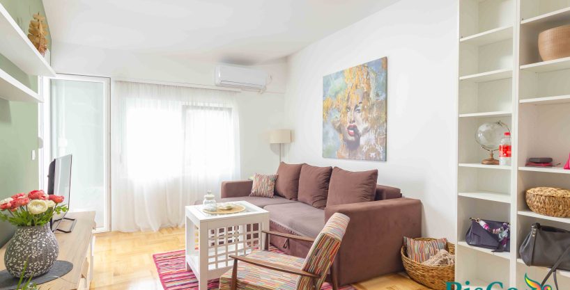 The apartment is very spacious, and with its 50m2, it makes a comfortable and pleasant living space. The living room has a corner sofa, TV and air conditioning, and a lot of decorative details that complete the ambiance. As part of the living room, there is a dining area with a table and chairs. The kitchen is partially separated from the living room, it is large and equipped with all the necessary elements and appliances. There is also a small pantry in the kitchen. The bedroom has a double bed and a wardrobe. The bathroom has a shower cabin and a washing machine. There is a built-in closet in the hallway. The apartment has a balcony, which is accessed from both the living room and the bedroom.
