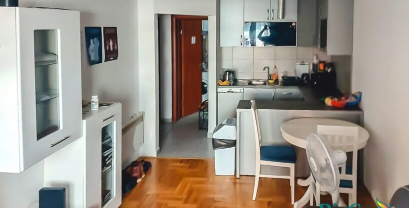 The apartment is very well designed and has a nice layout. The apartment is fully equipped with new and modern furniture, and it is being sold as such. The living room has a sofa, TV and air conditioning, and has an exit to the balcony. There is a dining table with chairs in the living room, and a kitchen below. The kitchen has a nice design, with all built-in appliances – stove, refrigerator, dishwasher. One bedroom has a double bed and a wardrobe, while the other has a single bed and a wardrobe, and is intended as a children’s room. The bathroom has a shower and has a washing machine and dryer.