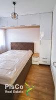 The apartment is fully equipped with new and modern furniture. The living room has a large corner sofa, TV and air conditioning, and has access to the balcony. The living room has a dining table with chairs, and then a kitchen. The kitchen is a beautiful design, with all built-in appliances – stove, refrigerator, dishwasher. One bedroom has a double bed and a wardrobe, while the other has two single beds and one wardrobe, and is designed as a children’s room. The bathroom has a shower, and has a washing machine and dryer. There’s another closet in the hallway.