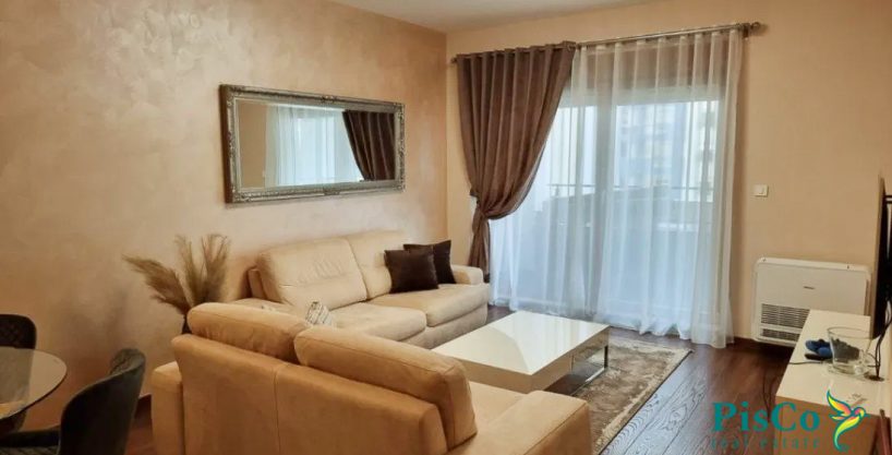 The apartment is comfortable, with a good arrangement of rooms, and decorated with modern and high-quality furniture. The living room has comfortable furniture, TV and air conditioning, and large balcony doors. This space is decorated with many fine decorative details, modern lighting and textiles. There is a dining area with a large table and chairs, and a kitchen below. The kitchen is spacious and functional, made of high-quality materials, and with all the necessary built-in appliances. It has bright tones and an interesting appearance, and it fits perfectly into the overall ambience of this space.