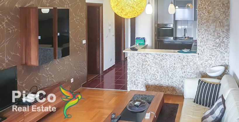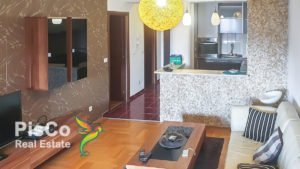 The living room has a corner sofa, TV and air conditioning, and has access to the balcony, and includes a dining area. The kitchen is separated by a bar, and functional, equipped with all necessary facilities. The bedroom is also spacious and comfortable. The bathroom has a shower.