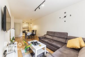 The apartment is nicely furnished and consists of a large living room that is very nicely decorated and has a smart TV. Then there is a kitchen with a dining table and chairs as well as all the kitchen elements (the kitchen has all the smaller appliances). In addition to the main rooms, there is also a bedroom with a large double bed and a large sliding wardrobe that can fit a lot of things. At the very end, there is a bathroom that is fully equipped, and let’s not forget to mention that the apartment has a balcony with a beautiful view.