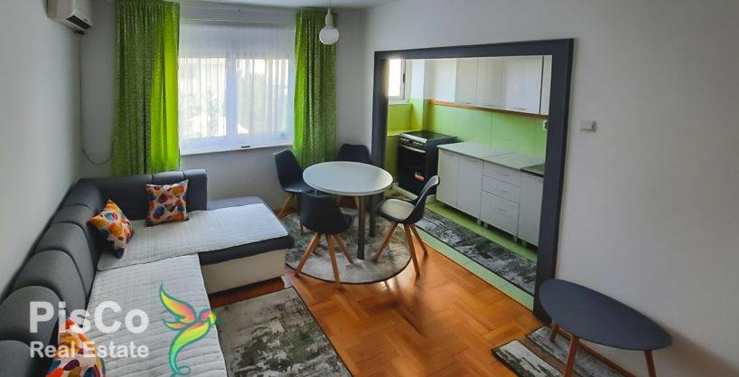 The apartment is beautifully designed, lit and newly furnished. The apartment has new furniture and has not been moved in yet. The living room is nicely lit, has furniture, TV and air conditioning. The dining room and kitchen are in the continuation of the living room. The kitchen is equipped with all necessary elements and appliances, and the dining room has a table and 4 chairs. The bedroom has a double bed and a wardrobe.