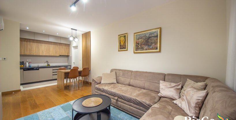 The apartment is luxuriously furnished and covers an area of 70 m². It includes two bedrooms, a spacious living room, a modern kitchen, a smart home system, as well as a contemporary-designed bathroom and an additional toilet. The living room and kitchen are connected in an open space, adding a sense of spaciousness and light. There is also a terrace with a beautiful view. The interior is carefully selected, with high-quality materials and luxurious finishes, from modern flooring to premium carpentry. The apartment’s design follows contemporary trends in architecture and decor, providing a sense of elegance and functionality.