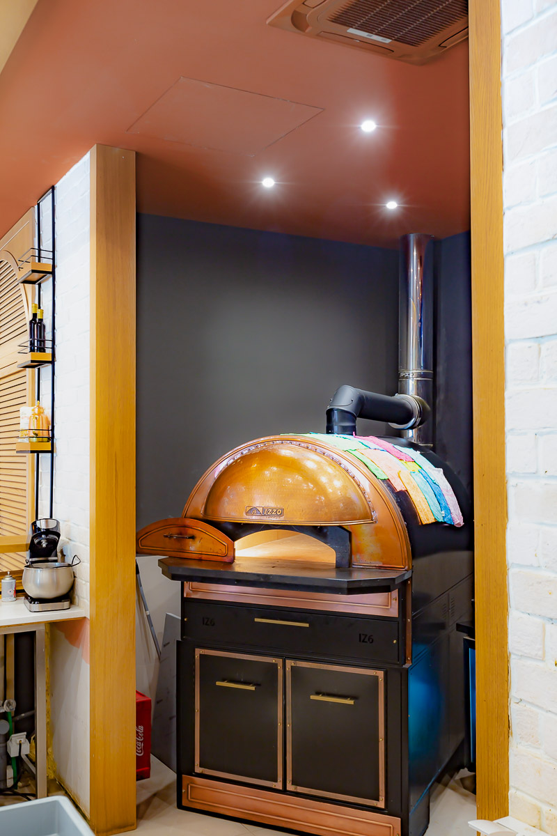 The kitchen is dominated by a professional pizza oven (Izzo/Izo Forni) and wood-fired baking. In premium hospitality, such equipment has a direct impact on quality, production speed, consistency, and brand perception.
