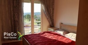 The apartment is nicely decorated, comfortable. The living room is spacious, with a corner sofa, TV and air conditioning. It includes a dining area with a table and chairs. The kitchen is separate, with all the necessary elements and appliances. The bedroom has a large double bed and a wardrobe. The bathroom is tidy, with a washing machine. The apartment has a terrace on the first floor, exiting from the living room, while the bedroom has a French balcony.