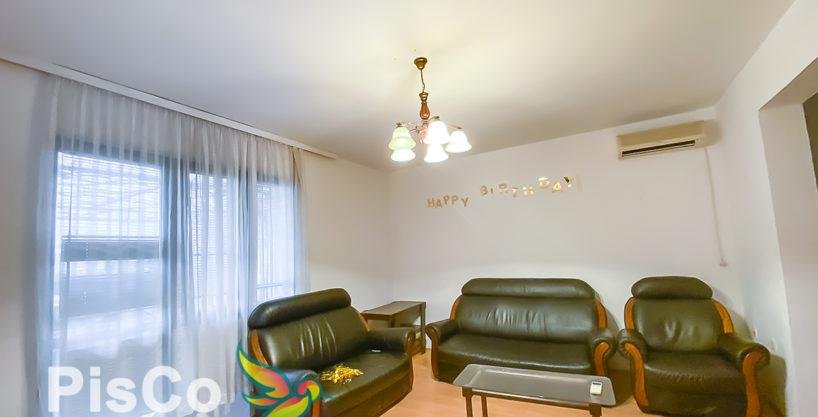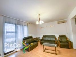 The apartment is three-room, 120m2. It is furnished with basic pieces of furniture, spacious and bright. The kitchen is new, with all necessary appliances, modern design and high quality. The living room has a three-seater, a two-seater and an armchair, air conditioning, and access to the balcony through large balcony doors that bring a lot of light into the living room. The bedrooms are also nicely lit and comfortable. The bathroom has fine ceramics, new sanitary ware, a shower cabin and a washing machine.