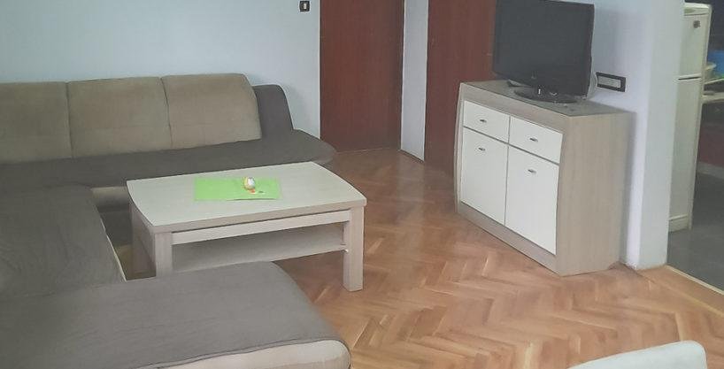 The living room is spacious and nicely lit by a large balcony door. It has a corner sofa, TV and air conditioning. There is a dining room and a kitchen next to the dining room. It is equipped with all necessary elements and appliances. One bedroom has a large double bed and a closet, while the other has only a closet, but in agreement with the owner it can be equipped. The bathroom is also nicely decorated. The apartment has a large balcony and is located in a small residential building.
