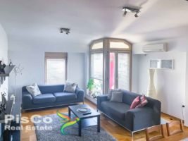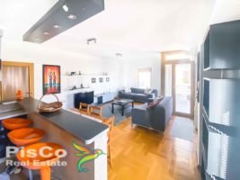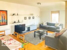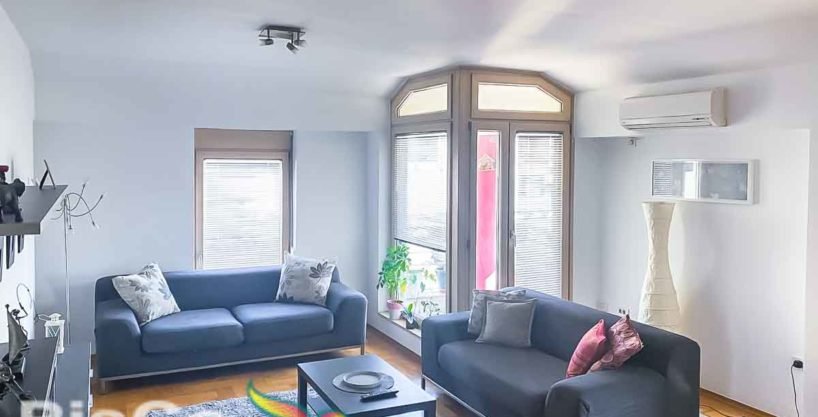 The apartment is fully equipped and spacious. The large living room is nicely lit, has nice furniture, TV, as well as access to the balcony. It includes a dining area with table and chairs, while the kitchen is separated by a large bar that can be used for dining because it has bar stools. The kitchen is spacious and functional and has all the necessary elements and appliances. Both bedrooms are equipped with beds and closets. The apartment has a bathroom that is nicely decorated, but also a guest toilet. It is also equipped with air conditioning.