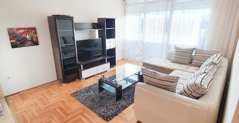 The apartment is nicely furnished, has a living room, kitchen and dining area, two bedrooms and a balcony, and at the very end there is a bathroom. The building is of recent construction and has a demit facade, and also what we must mention is that the building has an elevator and the floor is first.
