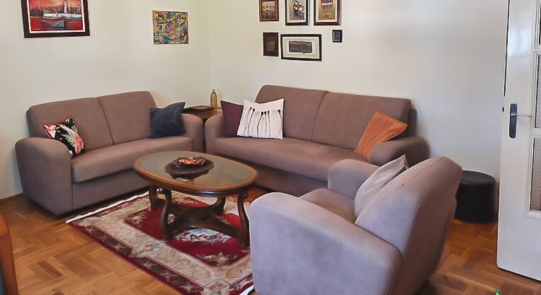 The apartment is comfortable, fully furnished and ready to move into. It has a living room, dining room and kitchen, two bedrooms, and a bathroom. The living room has a sofa, TV and air conditioning, as well as a dining area. The kitchen is equipped and has a balcony door. One bedroom is equipped with a large double bed and a wardrobe, while the other has a single bed and a couch.