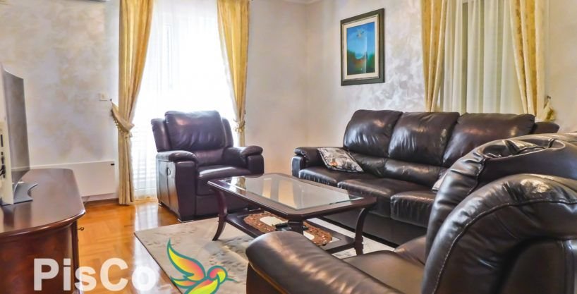 The apartment is fully equipped, with a good layout, spacious and comfortable. The living room has a leather sofa, sofa and armchair, TV, large balcony door. There is also a dining area with a large table and chairs, which is located next to other large balcony doors. The kitchen is completely separate, equipped with all necessary appliances and has a balcony door that allows natural ventilation of odors from the kitchen. One bedroom has a large double bed and wardrobe, and TV and is separated by a hallway from the living room. In that hallway there is one bathroom with a shower cabin, as well as a built-in closet. The second bedroom is designed as a children’s bedroom, has one small bed, cot, closet, and is located on the part that is also separated by a hallway. In this hallway there is another bathroom, larger, with shower, washing machine and tumble dryer.