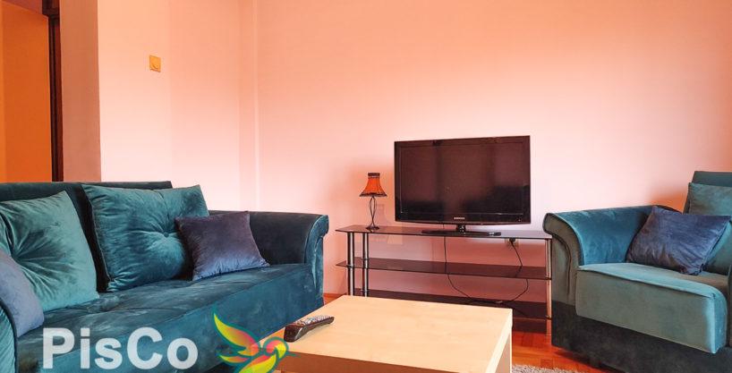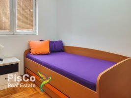 The living room has two seats and an armchair, TV and air conditioning and exit to the balcony. There is a dining table with chairs, while the kitchen is separated by a bar. It is also comfortable and functional. One bedroom has a double bed and a wardrobe, and the other is designed as a children’s room, it is nicely lit and spacious. The bathroom is nice, with a shower and a washing machine.