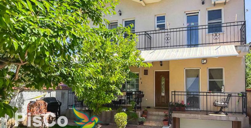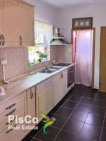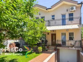 The house is located on a plot of 300m2, with a nice lawn, trees, surrounded by a stone wall, and a remote controlled gate. The house itself has two floors – on the lower floor there is a living room, dining room and kitchen, a pantry, and a toilet, and upstairs there are 4 bedrooms and 2 bathrooms. The living room is spacious, with large balcony doors leading to the terrace. It has all the furniture, decorative details, fireplace. There is a dining room with a table and chairs. The kitchen is separate, beautifully designed in light tones, spacious and functional. It has all appliances, and a large refrigerator. There is also a window in the kitchen as a natural ventilation for smells, and through which there is a view of the courtyard of the house. There is also a small pantry in the kitchen.