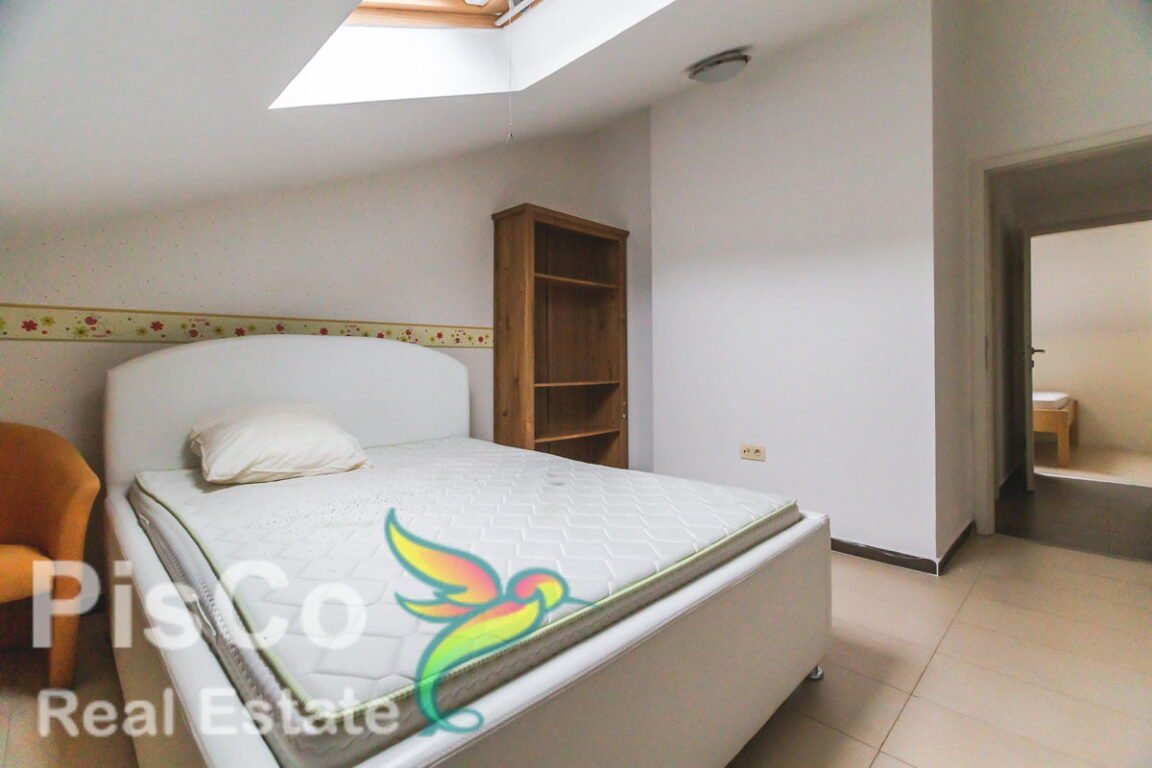Stan je na dva nivoa, a ono što odmah zapazimo je komfor i dosta svjetlosti. Okrenut jeprema jugo – zapadu. Na nižem spratu su dnevna soba, kuhinja, kupatilo i hodnik, sa velikom terasom, a do gornjeg sprate se stiže velikim i prostranim stepenicama. Na gornjem spratu su dvije prostrane sobe, kupatilo i vešeraj. Zaista dosta prostora. Zidovi su uradjenji u špatulato tehnici, tako da su veoma zahvalni za higijenu i održavanje. Podovi su takodje dobri, kuhinja naročito. Stan je klimatizovan, ima jedan balkon. Ispred zgrade ima dovoljno parking mjesta.