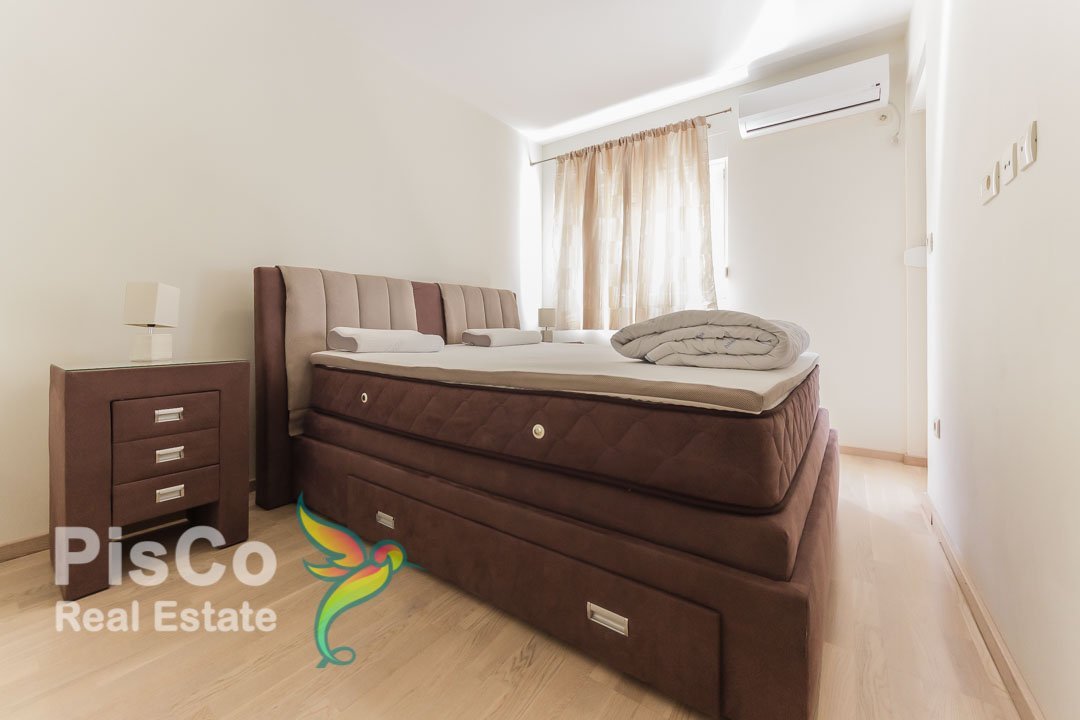 Stan se nalazi u novijoj zgradi, koja posjeduje demit fasadu i vrlo je kvalitetne gradnje. Sami stan je lusuzno sređen i opremljen i ostavlja vrlo jak utisak na prvi pogled. Lijep, udoban namještaj koji krasi dnevnu sobu i trpezariju život će vam učiniti ugodniji, a oprema i elementi u kuhinji olakšaće vam svaki posao u njoj. Kuhinja izuzetno lijepo uklopljena u sam enterijer stana. Dvije spavaće sobe koje su opremljene namještajem visokog kvaliteta, u joednoj su dva kreveta a u drugoj izuzetno udoban francuski ležaj. Stan posjeduje kupatilo koje je opremljeno izuzetno dobrom keramikom i sanitarijama i jedan wc. Dnevna soba i jedna soba imaju izlaz na terasu koja je arhitektonski lijepo dizajnirana. Treba naglasiti da stan posjeduje klimu u svakoj prostoriji.
