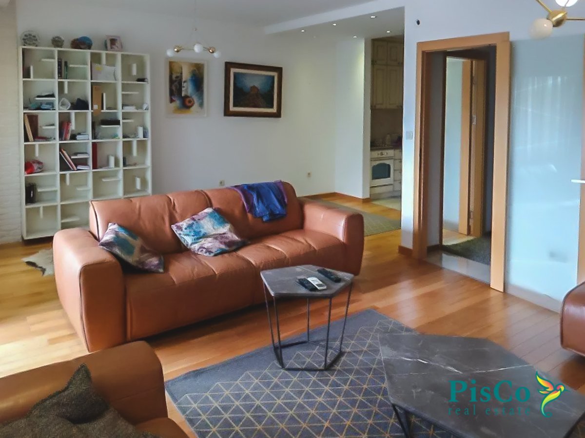 Stan je lijepo opremljen ima veliki dnevni boravak sa prelijepom garniturom i plazma televizorom iz dnevne imate izlaz na prelepu terasu koja gleda pravo na kružni tok kod palade i Moraču. Najbliža prostorija dnevnoj sobi jeste trpezarijski prostor koji ima sto sa stolicama, a tu je i kuhinja koja je potpuno izolovana što je ogromna prednost dok kuvate.