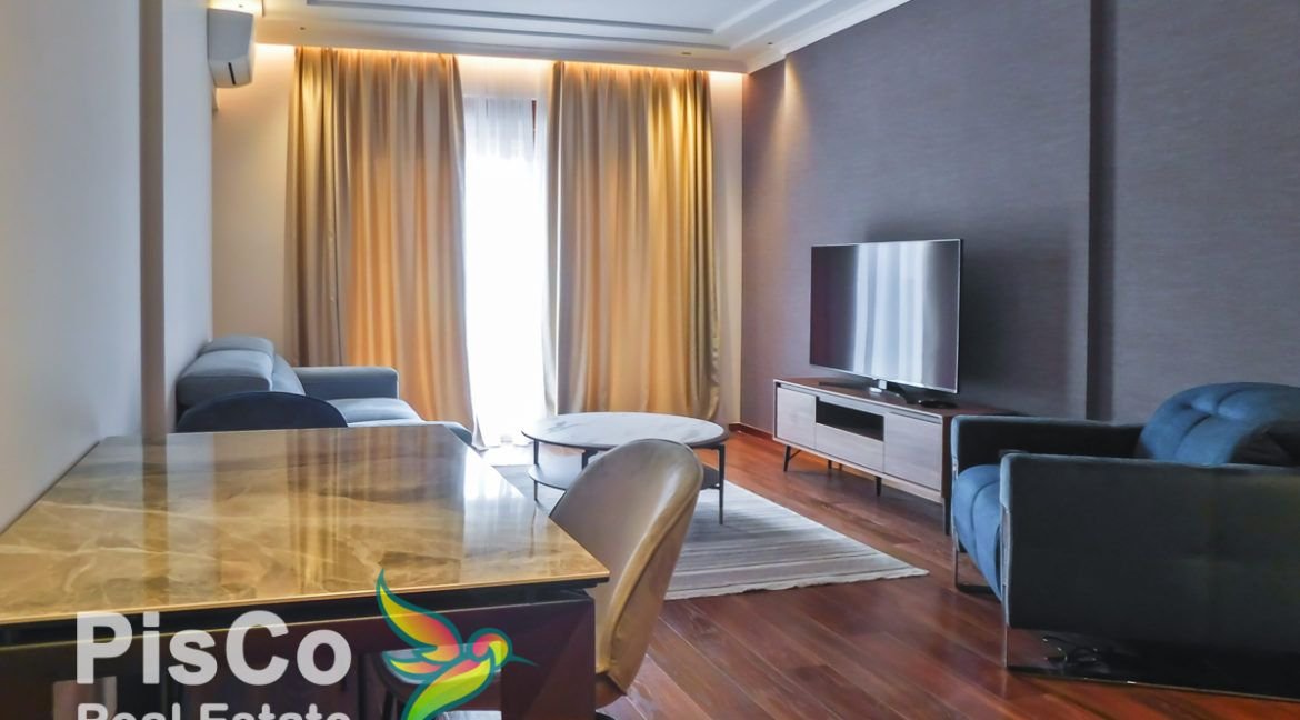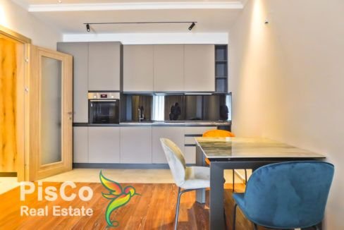 Stan koji odiše luksuzom i komforom, sa modernim i kvalitetnim namještajem. Dnevni boravak ima velika balkonska vrata koja doprinose dobroj osvijetljenosti. U dnevnoj sobi je lijep dvosed kao i fotelja koja se razvlači pritiskom na dugme, kao i TV i klima uređaj. U nastavku je trpezarijski sto sa stolicama, kao i kuhinja. Ona je moderna i kvalitetna, sa ugradnim uređajima marke BOSCH. Spavaća soba ima veliki bračni krevet i orman, i takođe ima izlaz na balkon. Kupatilo je lijepo, sa velikom tuš kabinom i veš mašinom.