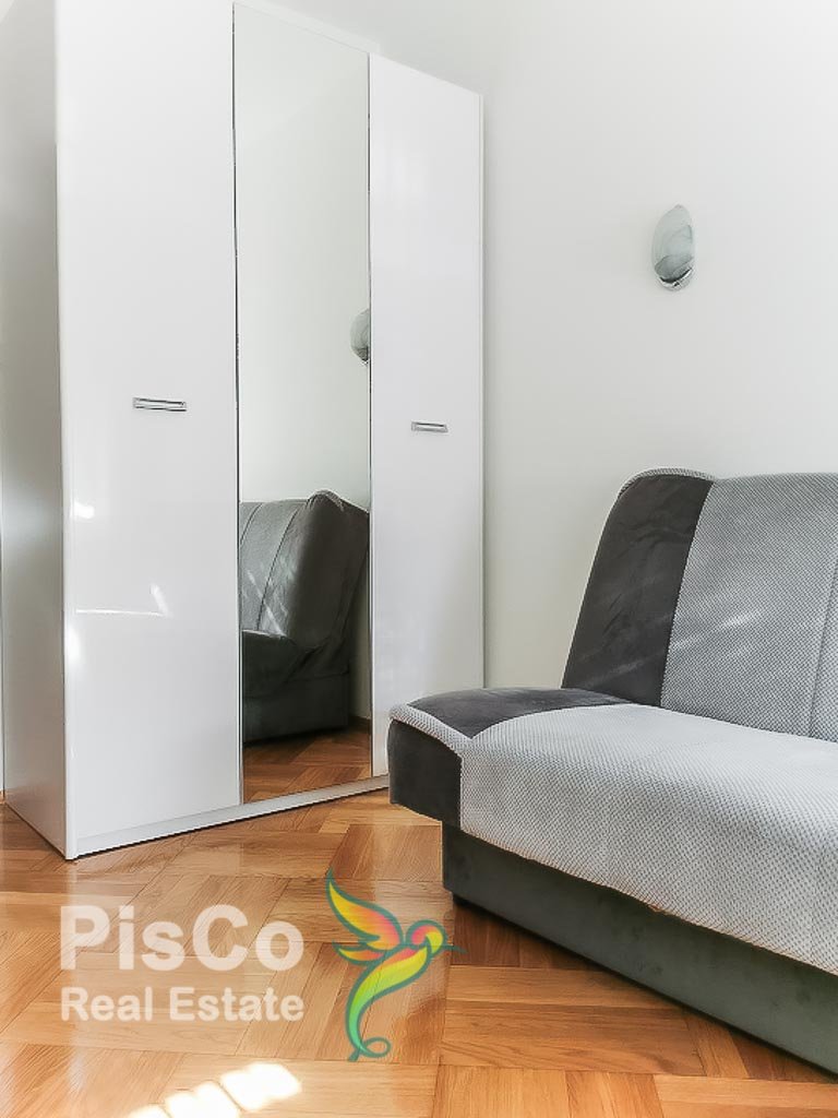 Stan je dvosoban potpuno namešten poseduje dve spavaće sobe od koje je jedna ima veliki bračni krevet, a dok druga ima krevet na rasklapanje koji dođe kao bračni. U svakoj sobi imate ormare za vašu garderobu, a tu je i velika dnevn soba koja ima izlaz na terasu. Sve se apsolutno može videti na slikama jer je stan apsolutno isti kao i na slikama. Pored dnevne imate i trpezarijski deo kao i kuhinju koja poseduje sve kuhinjske elemente.