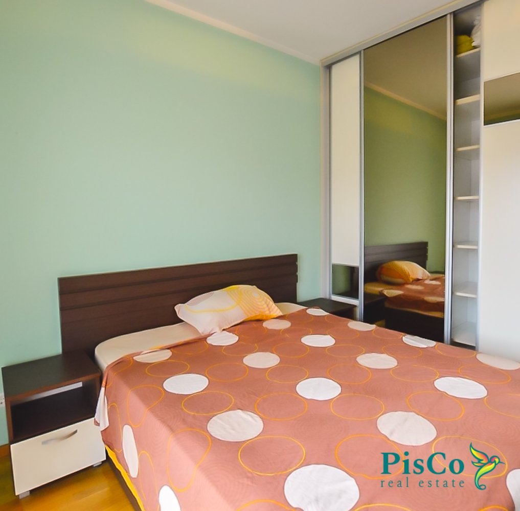 Ovaj jednosoban stan od 50m2 ima udobnu garnituru kao i komodu sa TV-om. U produžetku je trpezarija kao i komplet opremljena kuhinja. Spavaća soba je takođe skroz opremljena velikim francuskim ležajem i garderoberom. Stan je klimatizovan i izlazi na jednu terasu. Zgrada ima interfon i lift.