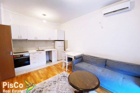 Ovaj jednosoban stan od 37m2 je jako lijepo namješten. Dnevna soba je upotpunjena ugaonom garniturom i komodom sa TV-om. U produžetku je trpezarijski sto sa stolicama, kao i kuhinja koja je opremljena svim neophodnim elementima i uređajima. Spavaća soba ima veliki francuski ležaj i veliki garderober. Stan je klimatizovan i ima izlaz na jednu terasu.